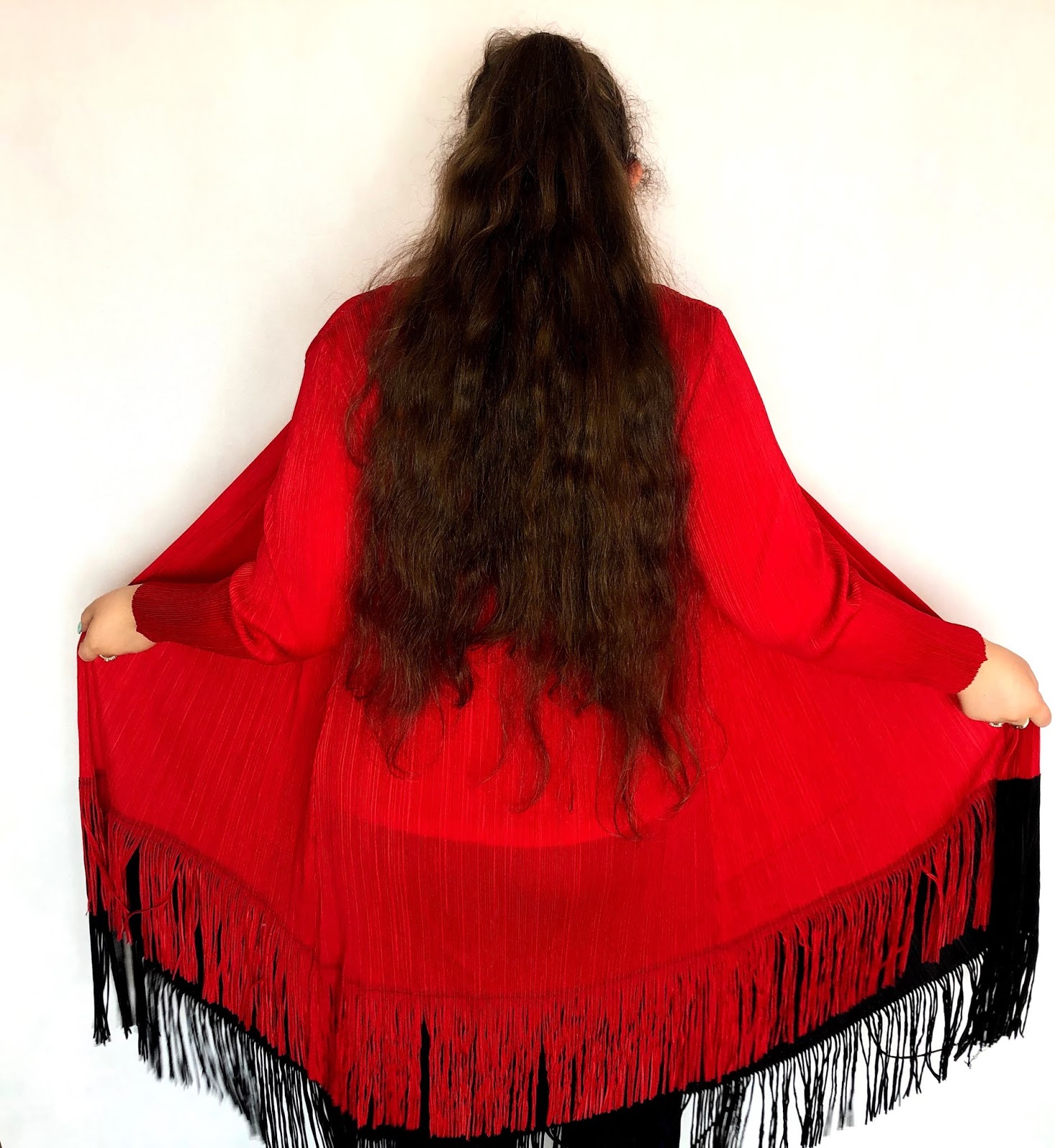 Kolejną sztuką mojego zamówienia jest czerwono czarna narzutka z frędzlami i tu wychodzi na to, że na frędzle też mam fazę xD Jest wykonana z bardzo ciekawego materiału takiego rozciągliwego, pomarszczonego, dzięki czemu nie trzeba prasować ;) Bardzo miła w dotyku, dodatkowym plusem jest to, że ma kieszenie, lubię także "inne" rzeczy więc będę chętnie nosić :]