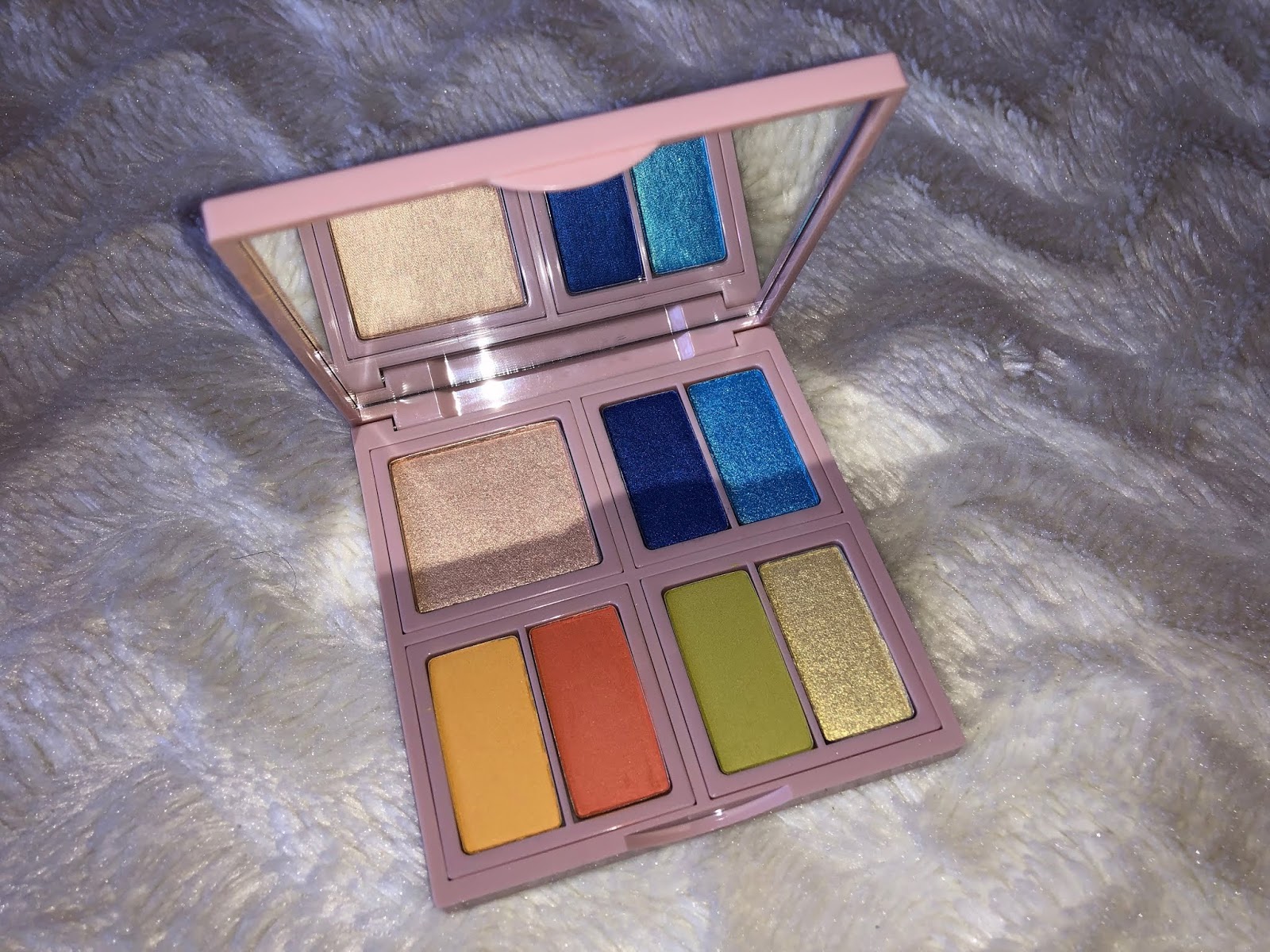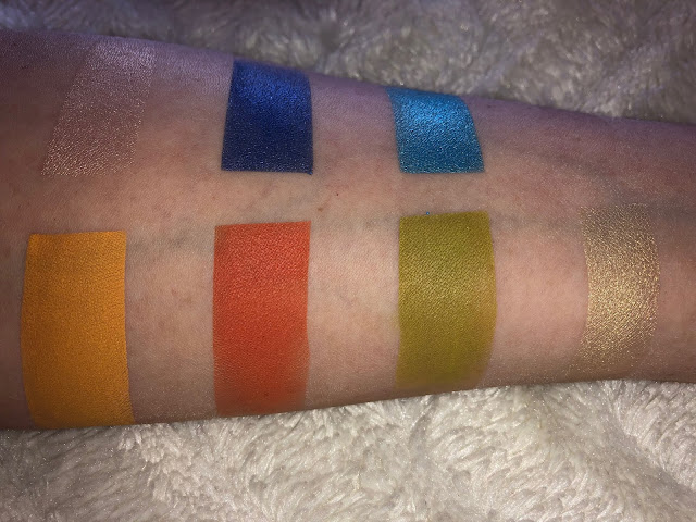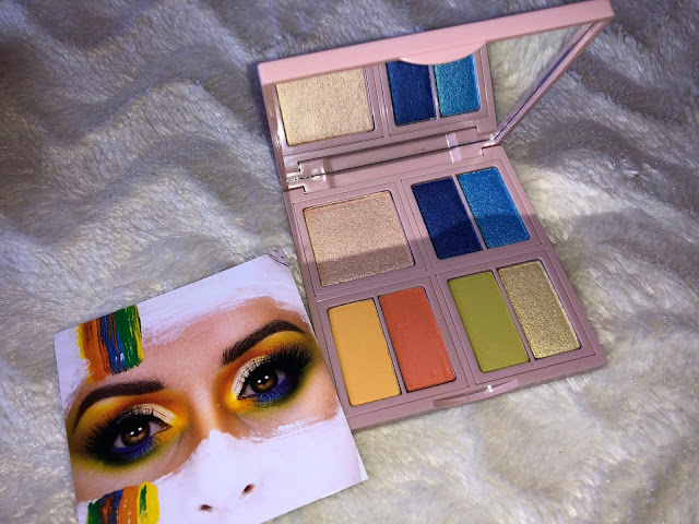 W palecie znajdziemy rozświetlacz- nr 1 Golden cream oraz cienie: granat/ niebieski- nr 2 Indigo bunting, żółty/ pomarańcz- nr 3 Flame, zielony/ błyszcząca zieleń- nr 4 High risk!. Jest to paleta zdecydowanie dla osób lubiących mocne kolory na oczach, a jak wiecie uwielbiam takie klimaty, im więcej koloru tym lepiej :P no dobra nie zawsze... xD Ogólnie na początku po zeswatchowaniu rozświetlacza byłam zawiedziona, wydawał mi się bardzo słaby, ale jak pozbyłam się już tej wierzchniej warstwy to polubiłam go. Nie jest to może najbardziej błyszczący rozświetlacz świata, ale daję radę, dobrze się go używa w codziennym makijażu, no i mamy go "pod ręką" w palecie co jest praktyczne. Jeśli chodzi o cienie to mamy 3 maty i 3 błyszczące. Jestem zakochana w odcieniach granatowym i niebieskim, wyglądają na oku fenomenalnie i super się mienią. Błyszcząca zieleń jest również bardzo piękna i nie mam drugiego takiego cienia w swoich zbiorach, najczęściej ląduję u mnie w wewnętrznym kąciku oka, gdyż tam wygląda obłędnie :D Jeżeli chodzi o maty to, niestety jak w przypadku jej siostry, którą recenzowałam w zeszłym tygodniu link tu ---> ... bardzo się osypują, są suche i za każdym najmniejszym dotknięciem pędzla trzeba strzepnąć nadmiar pyłu. Mają jednak świetny pigment i dobrze się blendują, pomarańcz w tej palecie jest nieco jaśniejszy niż w palecie viva a viva, natomiast między kolorem żółtym obu palet nie widzę najmniejszej różnicy.